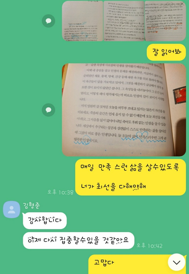 힘들 때 위로해주고, 책으로 마음 잡아주고, 집안일로 무기력을 막아주고, 공부가 가장 기본인 것에 대한 이야기를 끊임없이 해주었습니다.. 너무나도 고맙게도 수많은 고3들 중에 집안일 미션과 부모님 밥상 차려드리기 미션에 응했던 유일한 아이...그 아이의 인성을 감히 1등급 이라고 매기고 싶습니다.