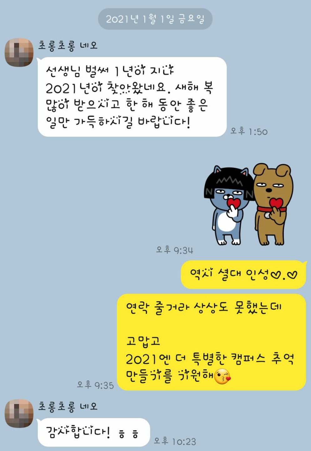 또 나의 판단이 틀리지 않았음을 느꼈던 지난해를 이어 올해도 1월 1일에 제 입시 컨설턴트라는 부캐의 자부심을 잃지 않도록 해 준 저 아이는 필자가 매기는 인성 등급 1등급입니다.