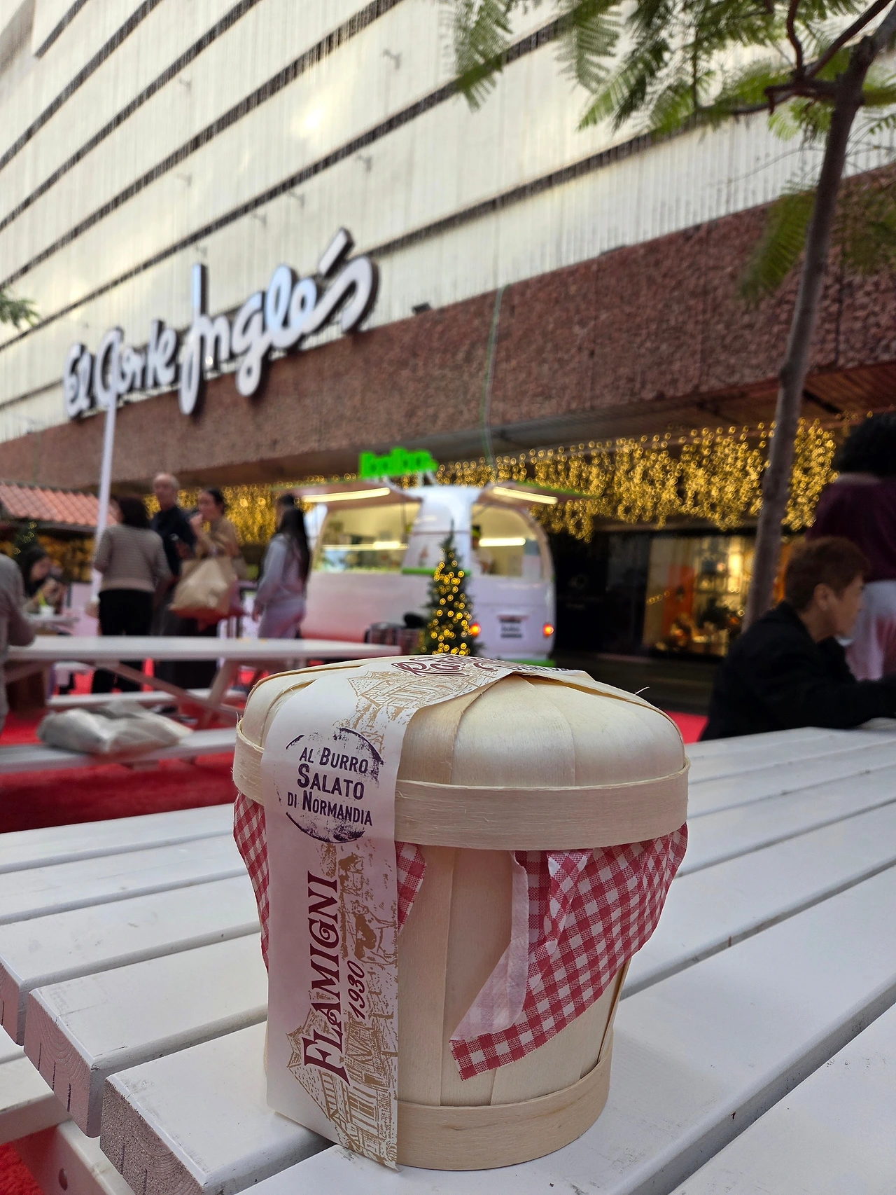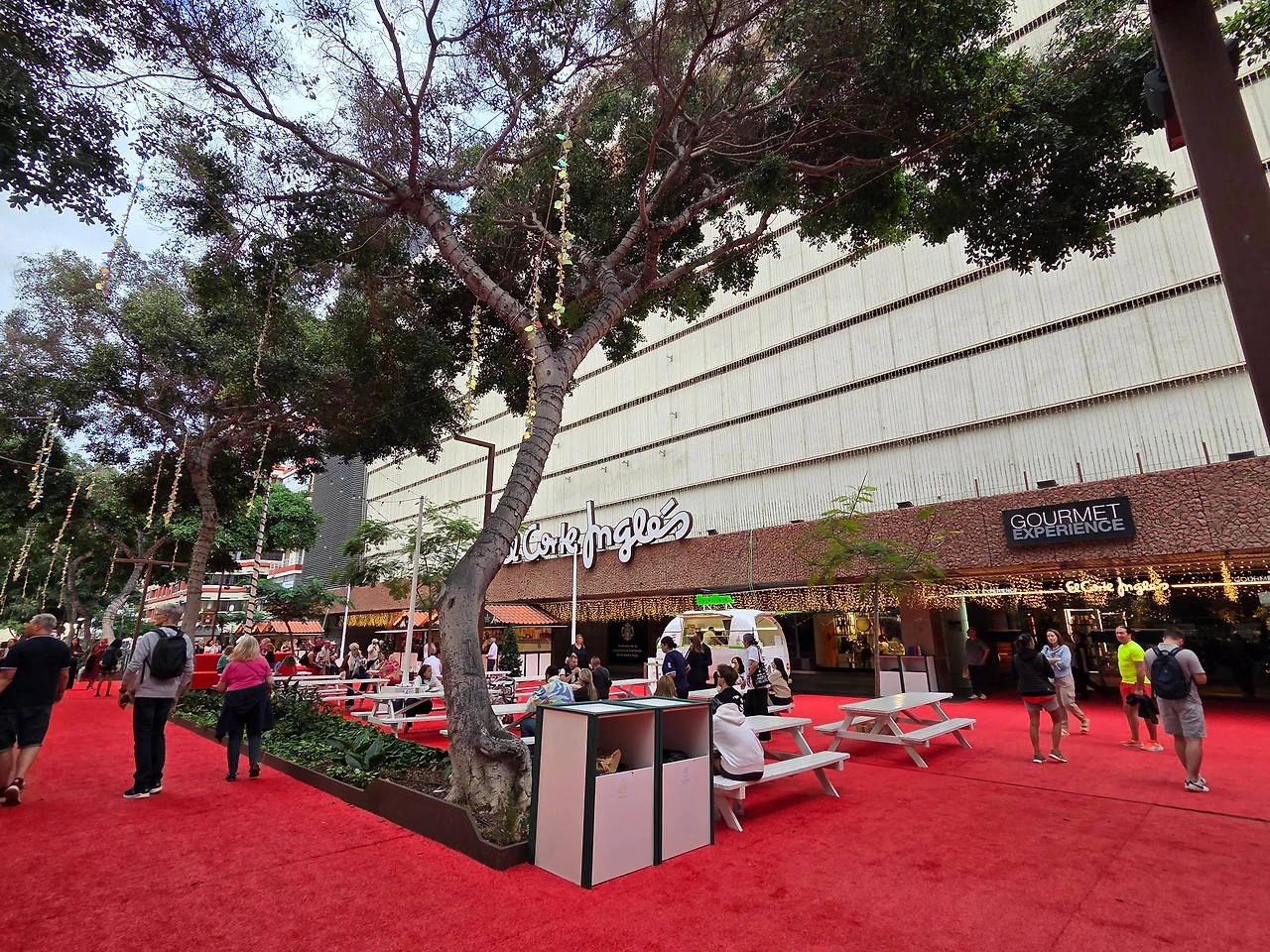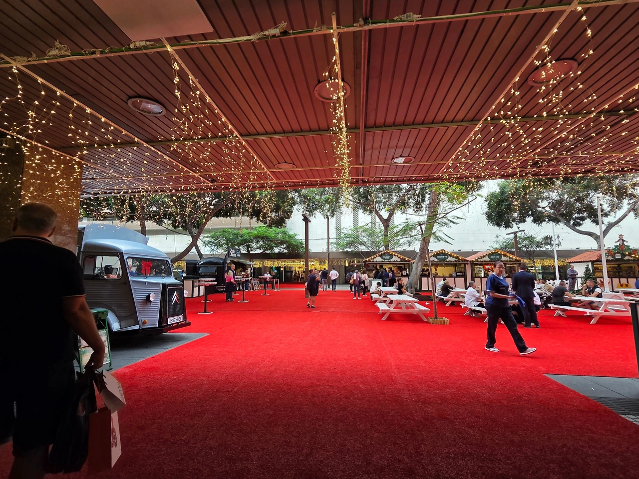 백화점(El Corte Inglés) 앞 광장에는 강렬한 **붉은 카펫(Red Carpet)**이 깔렸고, 그 위로 아기자기한 목조 마켓 부스들이 들어섰다. 반팔 혹은 긴팔을 입고 지나가는 사람들 위로 반짝이는 크리스마스 조명, 그리고 그 옆을 묵묵히 지키는 거대한 야자수의 조화는 볼 때마다 묘하고 이국적이다.