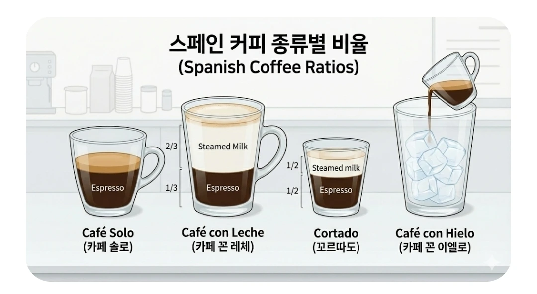 스페인의 커피 주문법은 조금 더 섬세하고, 조금 더 진하다. 말로만 들어선 감이 잘 안 올 테니, 아래 그림을 보며 하나씩 살펴보자.