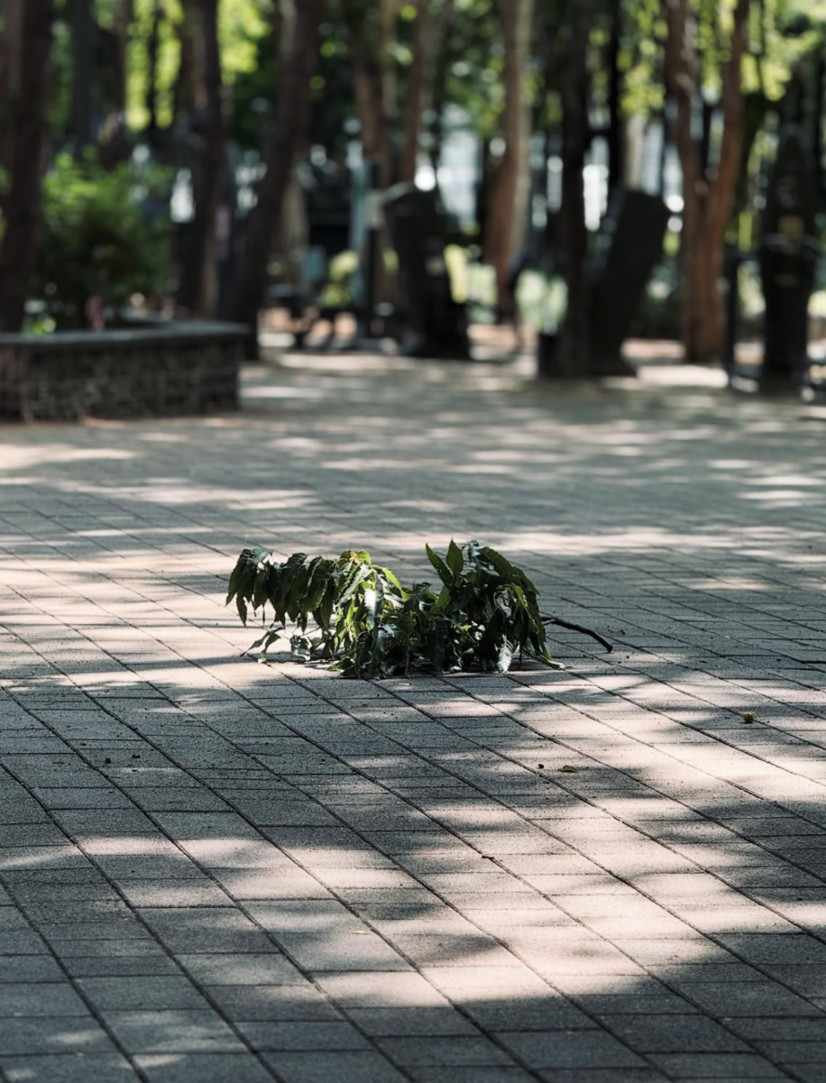 전날의 비바람이 지나간 자리, 여전히 푸른 나뭇가지 하나가 낯선 바닥 위에 덩그러니 놓여 있었다.