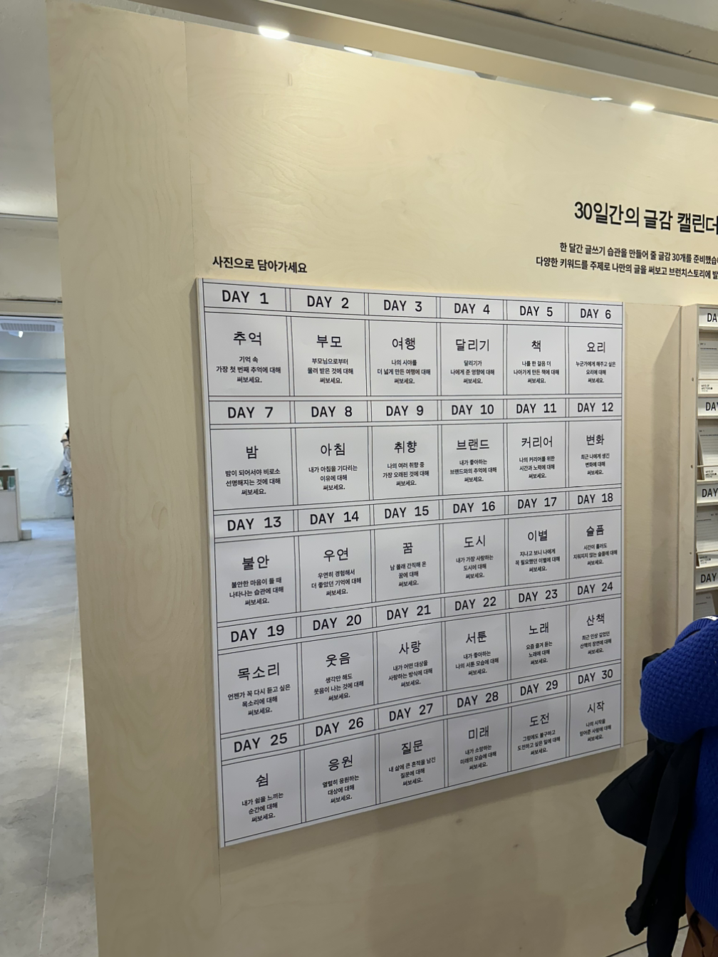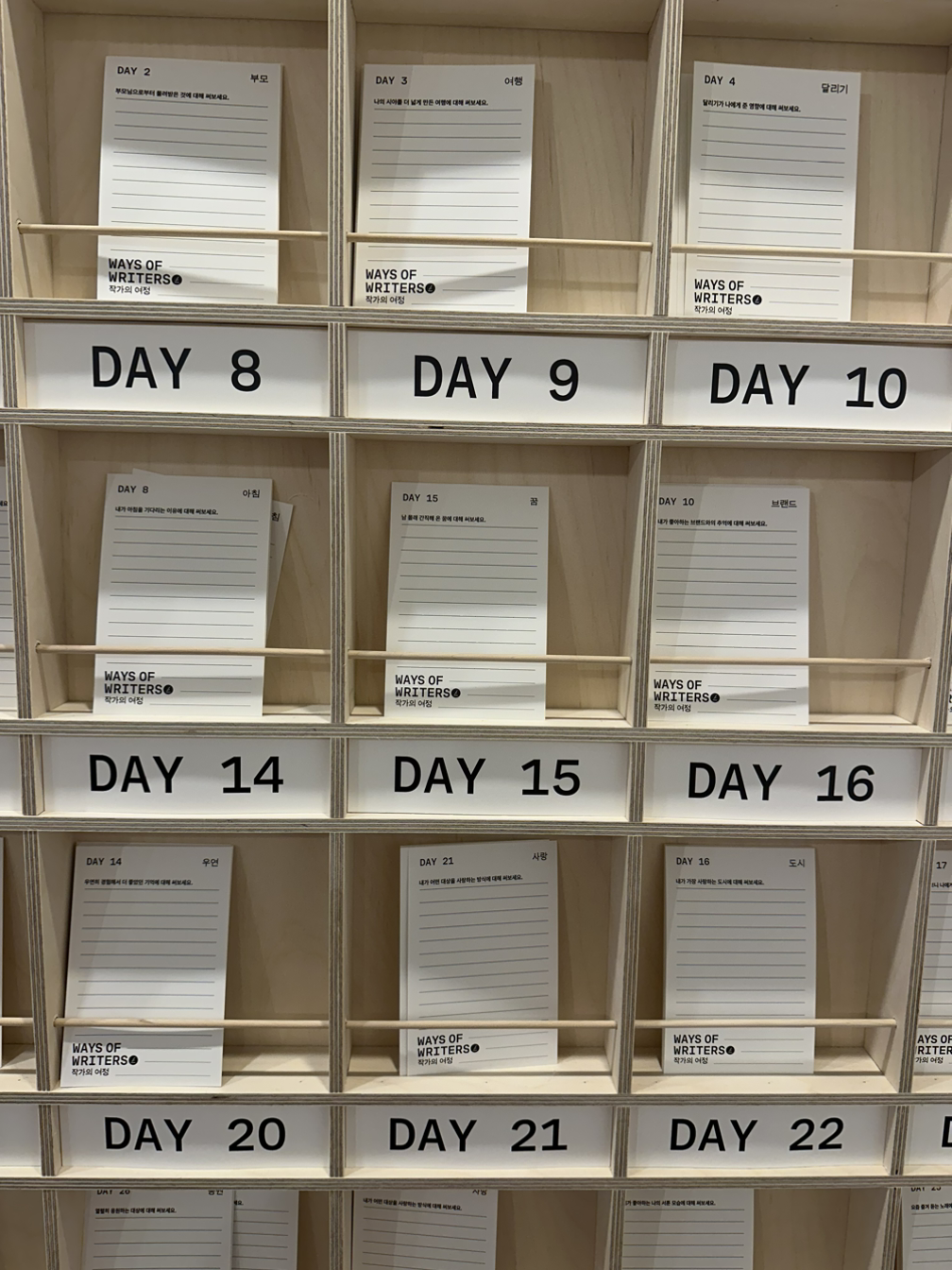 전시장 가운데, 30일간의 글감 캘린더가 있었는데 "마음에 드는 글감을 가져가세요."라고 안내되어 있고 여유 있게 남아있는 인쇄된 종이 중 단 두 장 남은 글감 테마는, 15일째의 "남몰래 간직해 온 꿈에 대해 써보세요."였다.