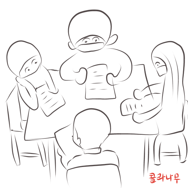 하위권 아이들의 행동이 재미나다. 이들은 세부류로 나뉘는데, 받자마자 멍 때리며 바로 엎드리는 아이 또는 이리저리 빠른 걸음으로 돌아다니며 지식 구걸? 하러 기웃거리는 아이가 있다. 물론 거부당하기 일쑤다. 이들을 받아주는 팀이 단 한 팀도 없다는 것이 놀라웠다. 급우인데도 냉정하게, 가차 없이 차단한다. 몇 번을 시도하다 지쳐 혼자서 해결하다 20분쯤 지나 엎드려 잔다. 마지막 부류는 어깨너머로 지식 도둑?을 선택한다. 핀잔도 듣고, 서러움도 당하지만 몇 개씩 얻어오는 것으로 만족한다.