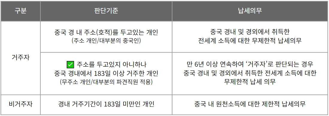 2019년 개정된 중국 개인소득세법에 따라 2024년 기준 매년 183일 이상 만 6년 연속 거주한 외국인(무주소 개인)은 2024년 귀속 소득분부터 중국 외 발생 소득을 포함한 전 세계 소득에 대하여 중국 과세당국에 신고 및 납세의무를 가지는 바, 관련자료를 첨부하니 참고하기 바랍니다. 감사합니다.