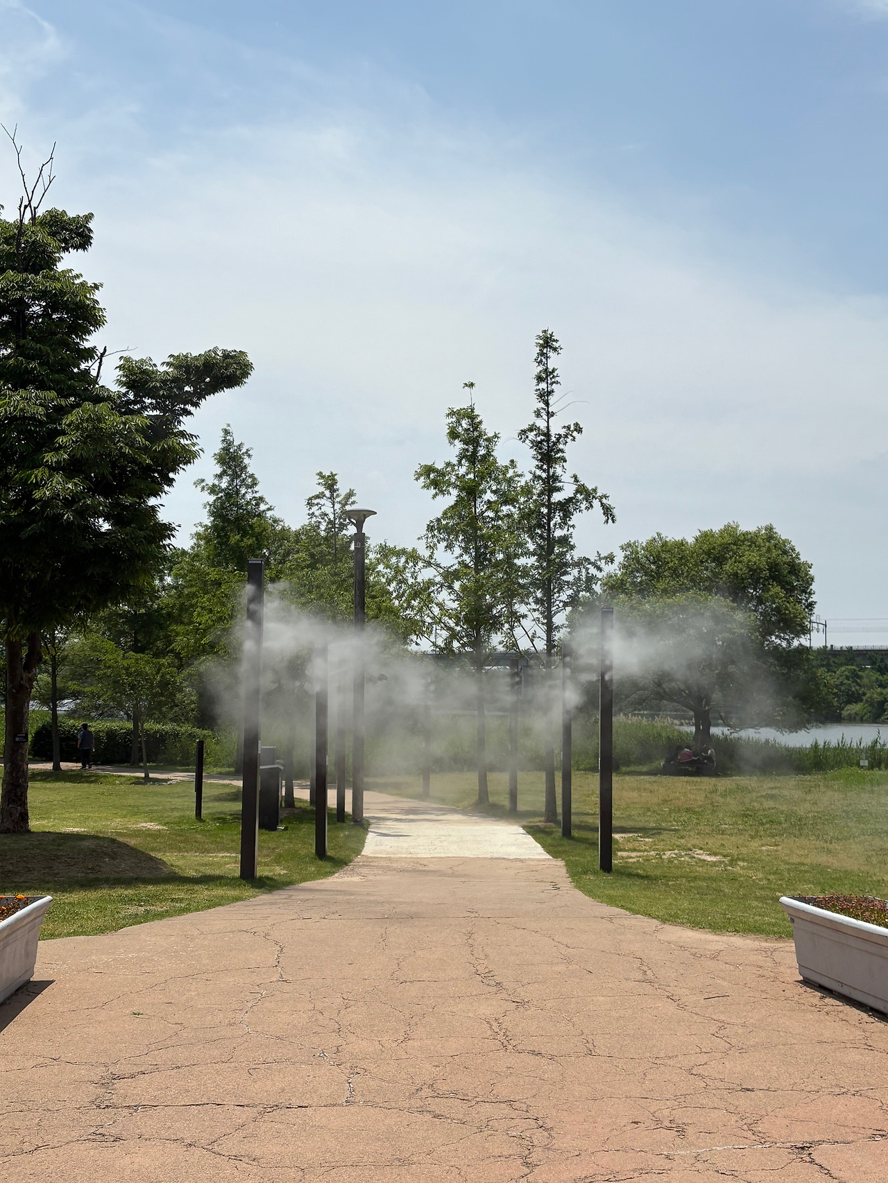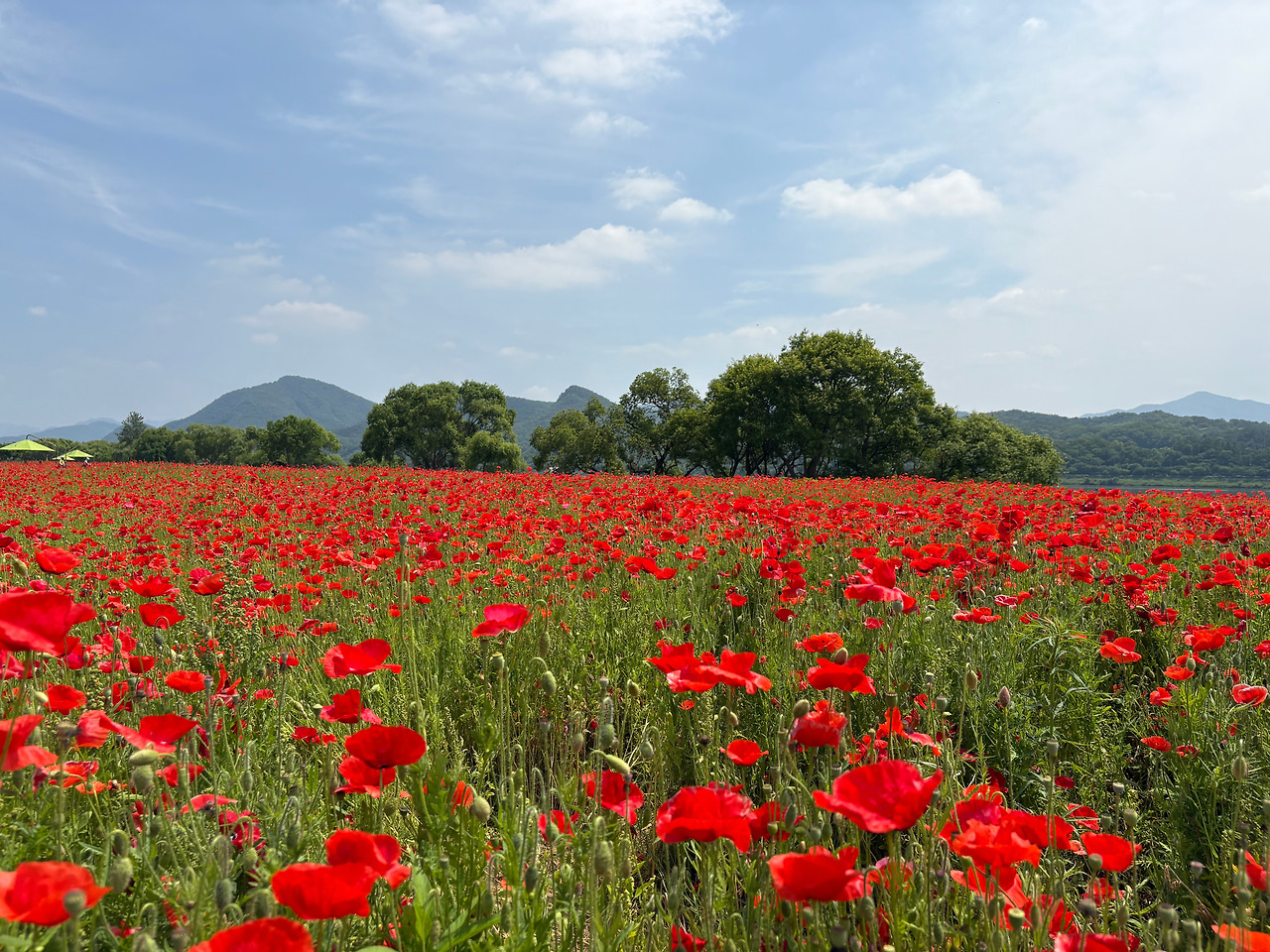 날이 더워지기 시작해서인지 입구 옆 잔디 공원으로 가는 길엔 짧지만 미스트가 분사되어 나오고 있었다. 먼저 나무 밑 그늘진 곳을 산책하고 본격적으로 꽃양귀비꽃을 보기 위해 작은 다리를 건넜다. 건너자마자 활짝 핀 양귀비꽃이 끝도 없이 펼쳐 저 있었다. 꽃밭 오른편으론 북한강이 흐르고 있고, 왼편으로는 차들이 다니는 도로다. 폭은 그리 넓은 편은 아니나 길이가 가늠할 수 없을 만큼의 긴 길이로 끝없이 활짝 핀 꽃들로 장관을 이루었다. 천천히 걸으며 사진도 여러 장 찍었다. 하지만 장관을 이뤄 보기 좋은 꽃들도 뜨거워진 했볕 아래에 선 마음에 오래 머물지 못했다. 친구와의 도란도란 이야기 속에서도 이겨내지 못했다. 햇볕을 가려 줄 구름 한 점이 필요했고, 한 줄기 바람이 그리웠다. 중간중간 파라솔이 있긴 했지만, 이용하고픈 마음은 전혀 들지 않았다. 산책하듯 오래 머물며 꽃을 즐기고 싶었고 친구와도 더 긴 시간을 함께하고 싶었다. 그러나 친구도 나도 그늘 한 점 없는 그곳을 더 걸을 수가 없었고, 시원함을 찾아 커피숍으로 발길을 돌렸다.