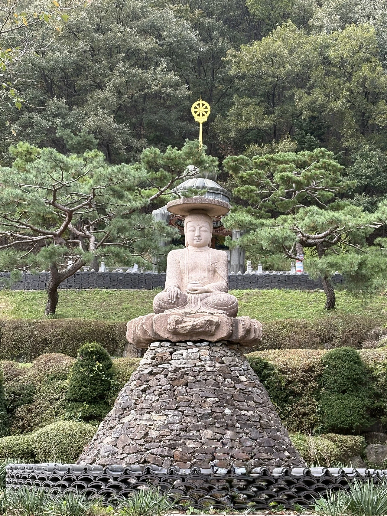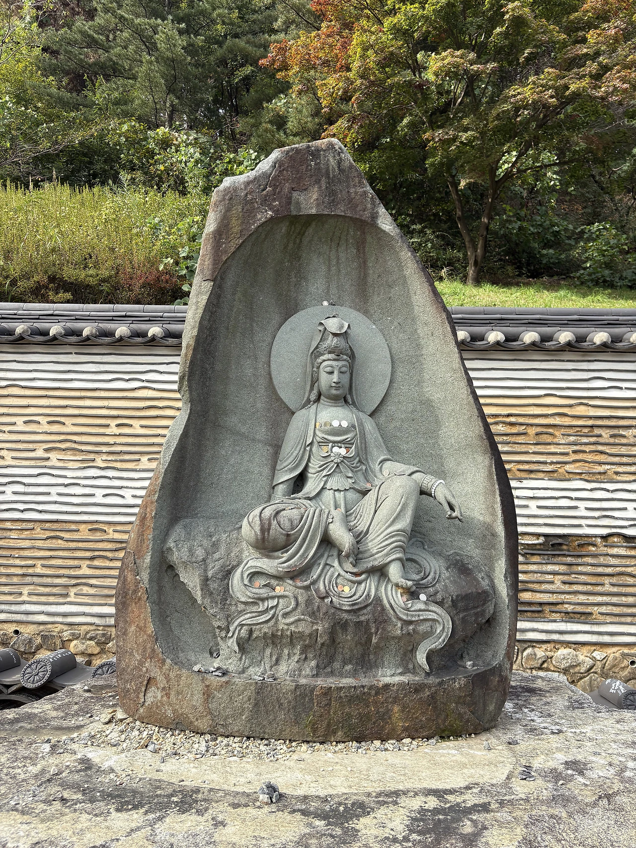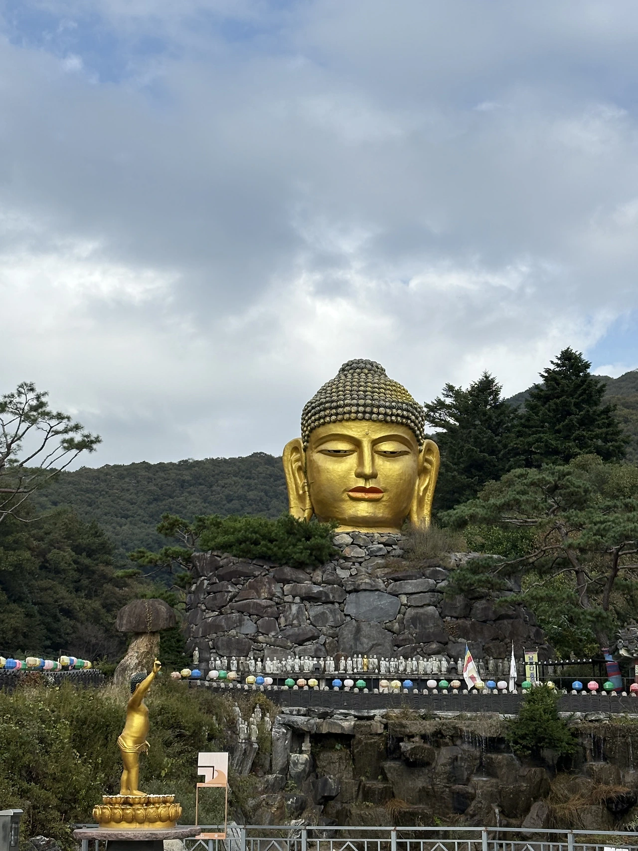 특징: 절 입구 연못 위에 설치된 압도적인 크기의 불상