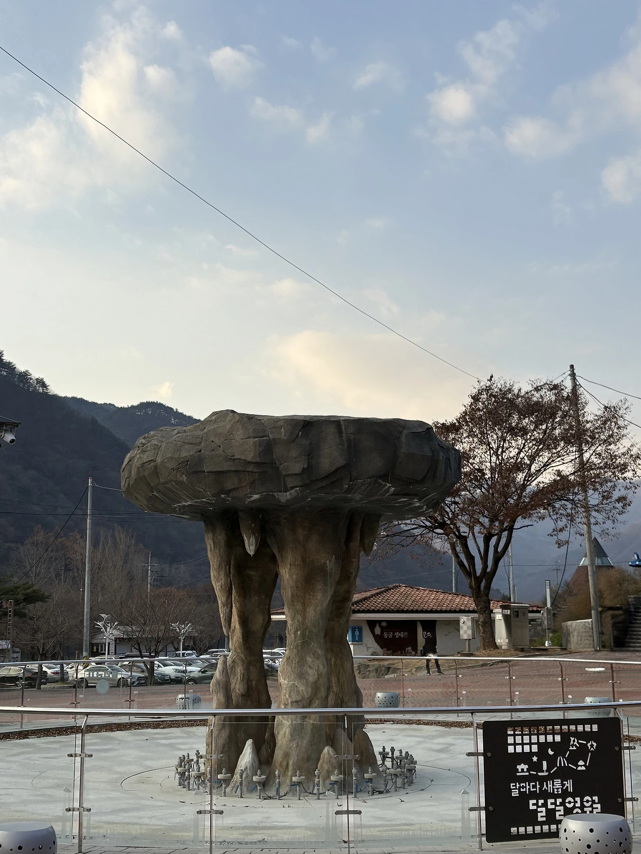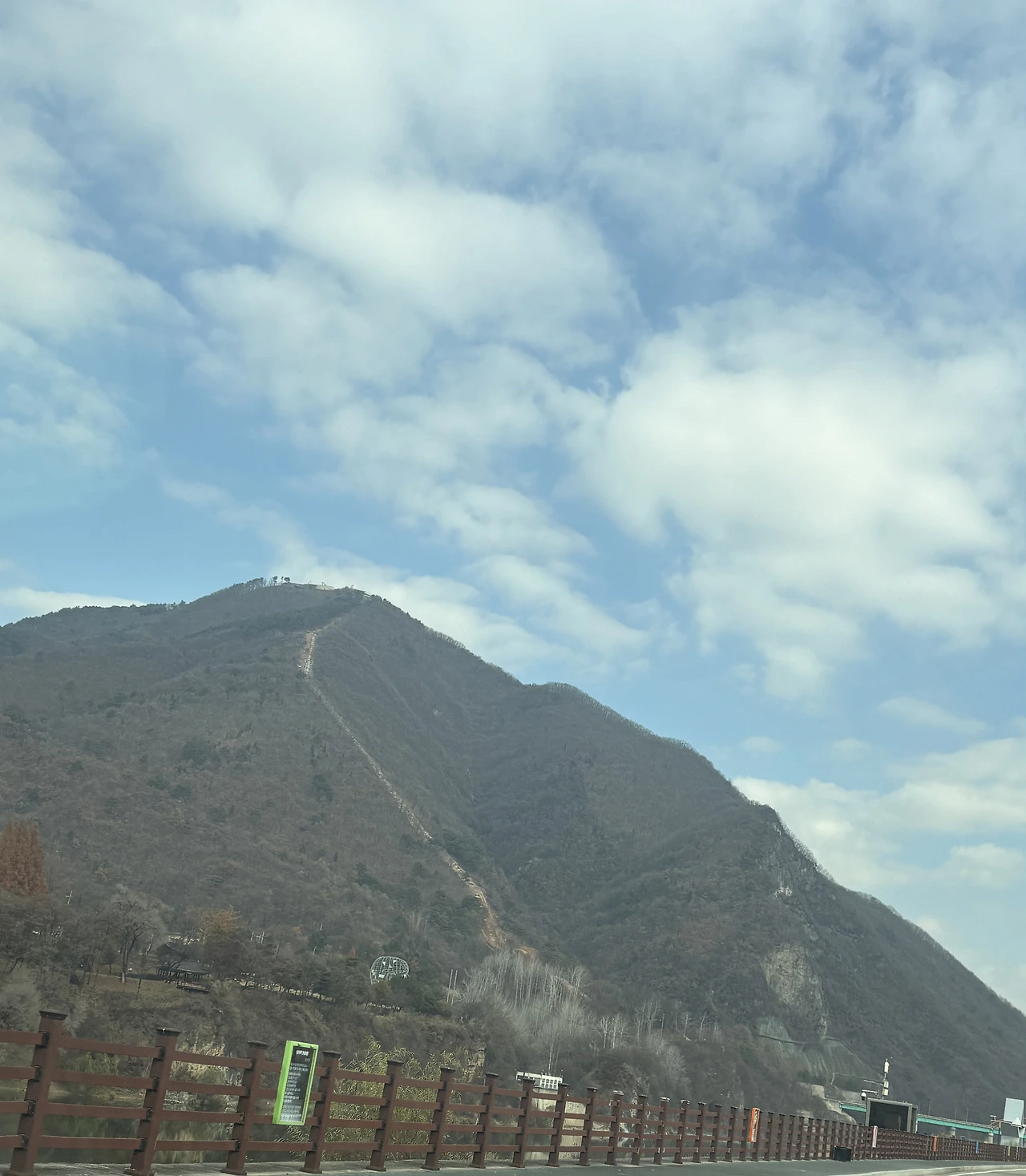 "왼쪽에 보이는 산이 '봉래산'이에요. 영화 라디오 스타에 나온 곳. 맨 위에 보이는 곳이 영화에서 마지막 콘서트가 열린 곳이에요. 지금 정상까지 올라가는 모노레일을 설치 중이에요."
