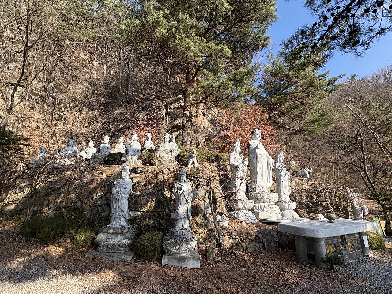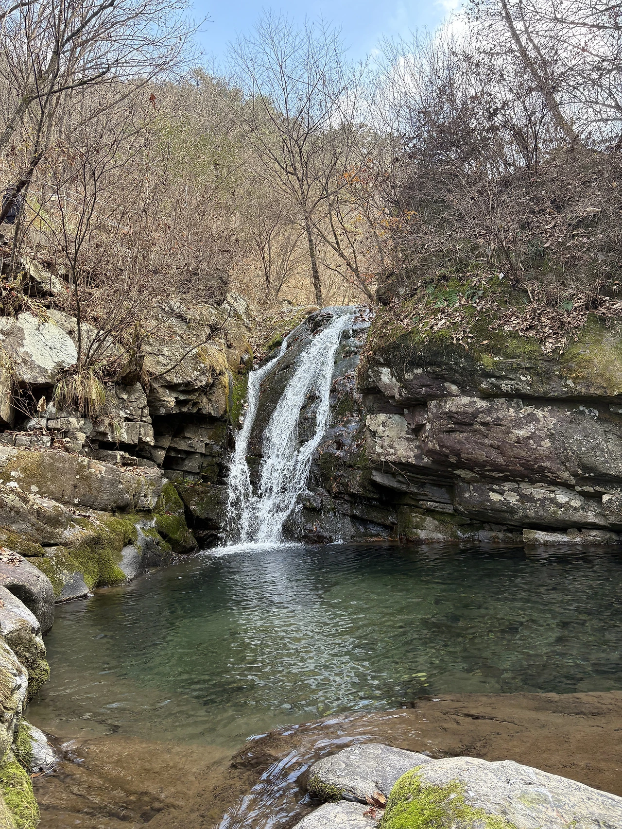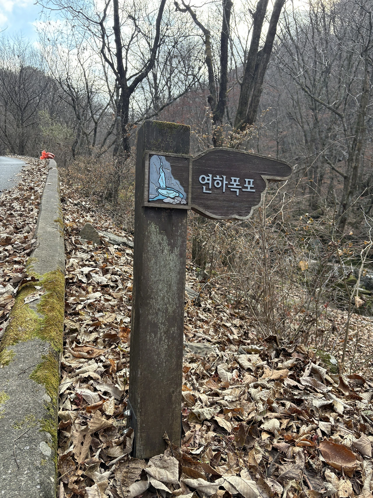 잠시 내려 폭포 앞에 서 보았다. 기대 없이 내린 발걸음에 비해 풍경은 조용히 제 몫을 하고 있었다. 차가운 물소리가 먼저 다가왔고, 늦가을의 햇빛이 물 위에 내리 앉으며 차가움을 살짝 녹였다. 폭포라는 이름이 부끄러울 만큼 넓지도, 높지도 않았지만, 잠깐이라도 마음을 씻기에는 충분했다. 짧은 멈춤이 오늘 일정의 균형을 잡아주는 듯했다.