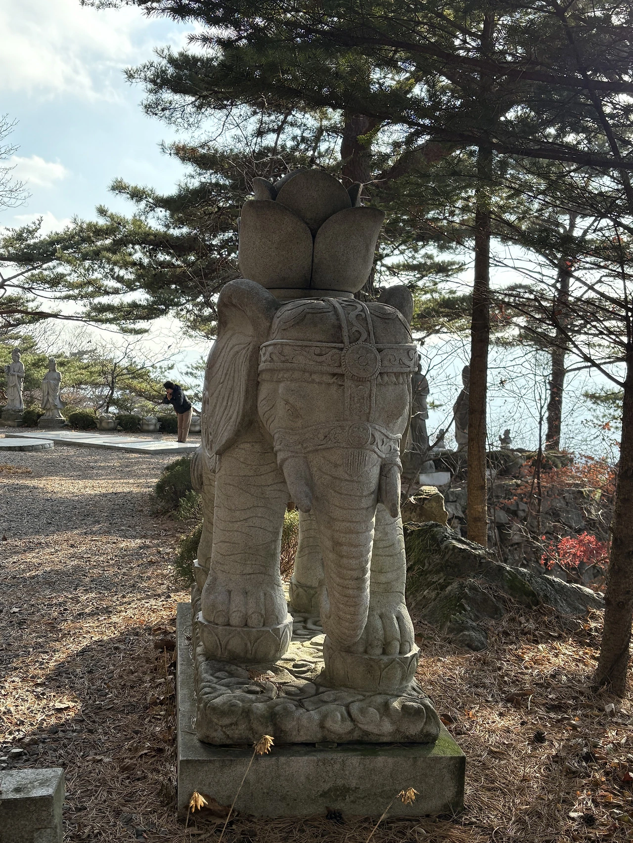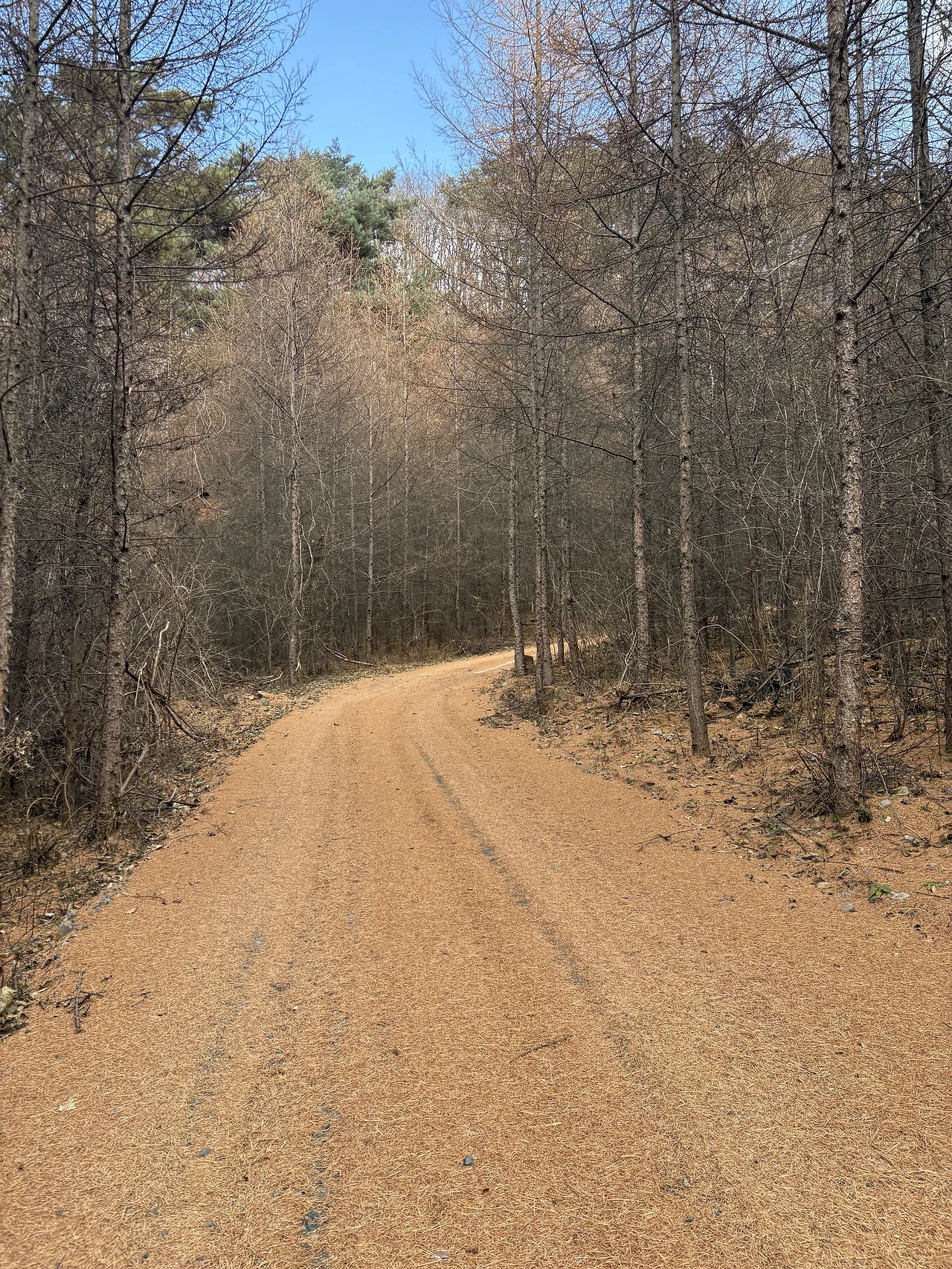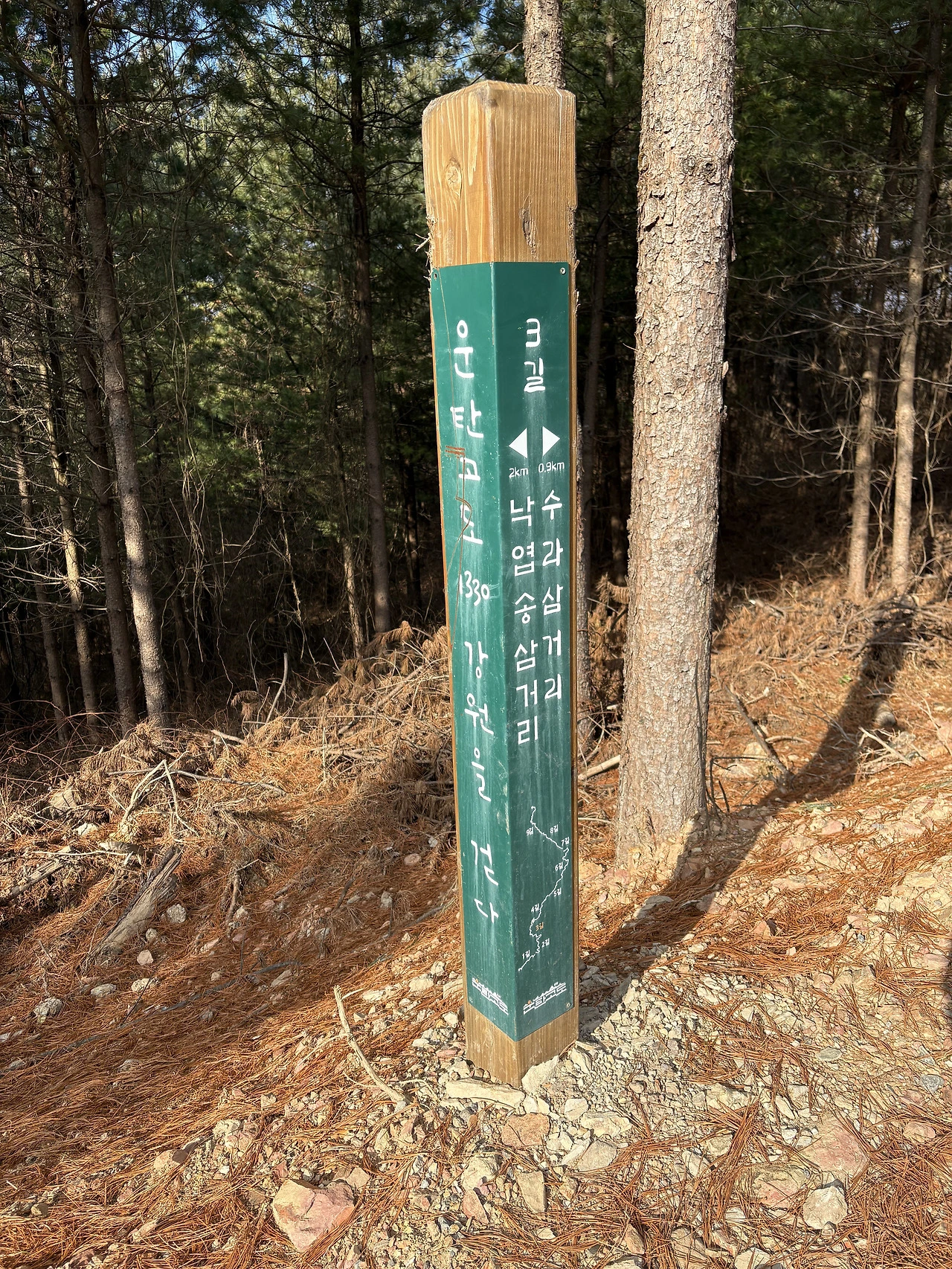 산길을 한참 올라 걷다 보니, 노랗게 물든 낙엽송의 바늘잎이 길을 두툼하게 덮어 발걸음마다 포근함이 전해졌다. 그 따뜻함이 전해지는 색감과 발밑에 느껴지는 감각이 잔잔히 마음을 가라앉혔다.