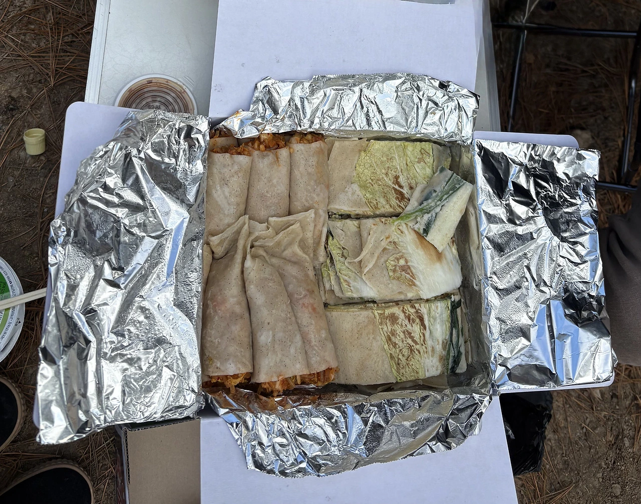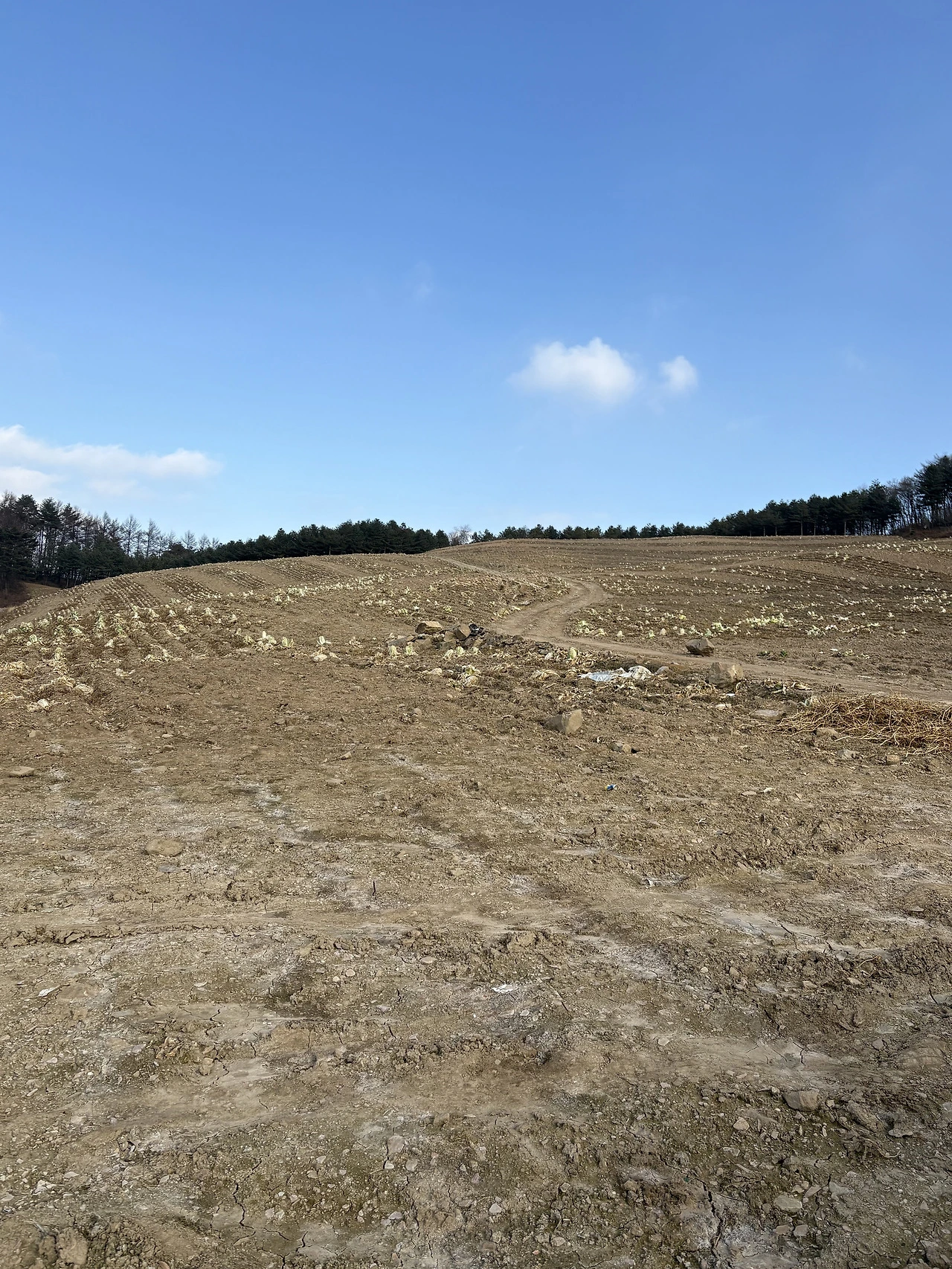 얼마나 걸었을까, 산 아래 넓디넓은 배추밭이 나타났다. 모두 뽑아 출하한 뒤라 황량했지만, 상품 가치가 없어 남겨진 배추를 보자 동서는 배추를 탐내했다. 강원도 오지 추운 곳이라 모두 얼어 동태가 된 배추를 동서를 따라 나도 확인해 봤다. 겉 삼분의 이는 얼었지만 노란 속은 여전히 온전한 상태를 유지했다. 쌈을 워낙 좋아하는 나는 욕심이 났지만 세 개만 골라 비닐봉지에 담아왔다. 색다른 재미였다.