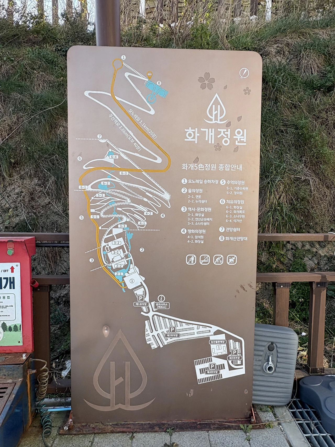 모노레일 (화개산 모노레일) : 정원 입구에서 정상부까지 이동할 수 있는 필수적인 교통수단이다. 걸어서 올라갈 수도 있지만, 모노레일을 이용하면 편리하게 오르내릴 수 있으며, 이동 중에도 아름다운 경치를 감상할 수 있다.