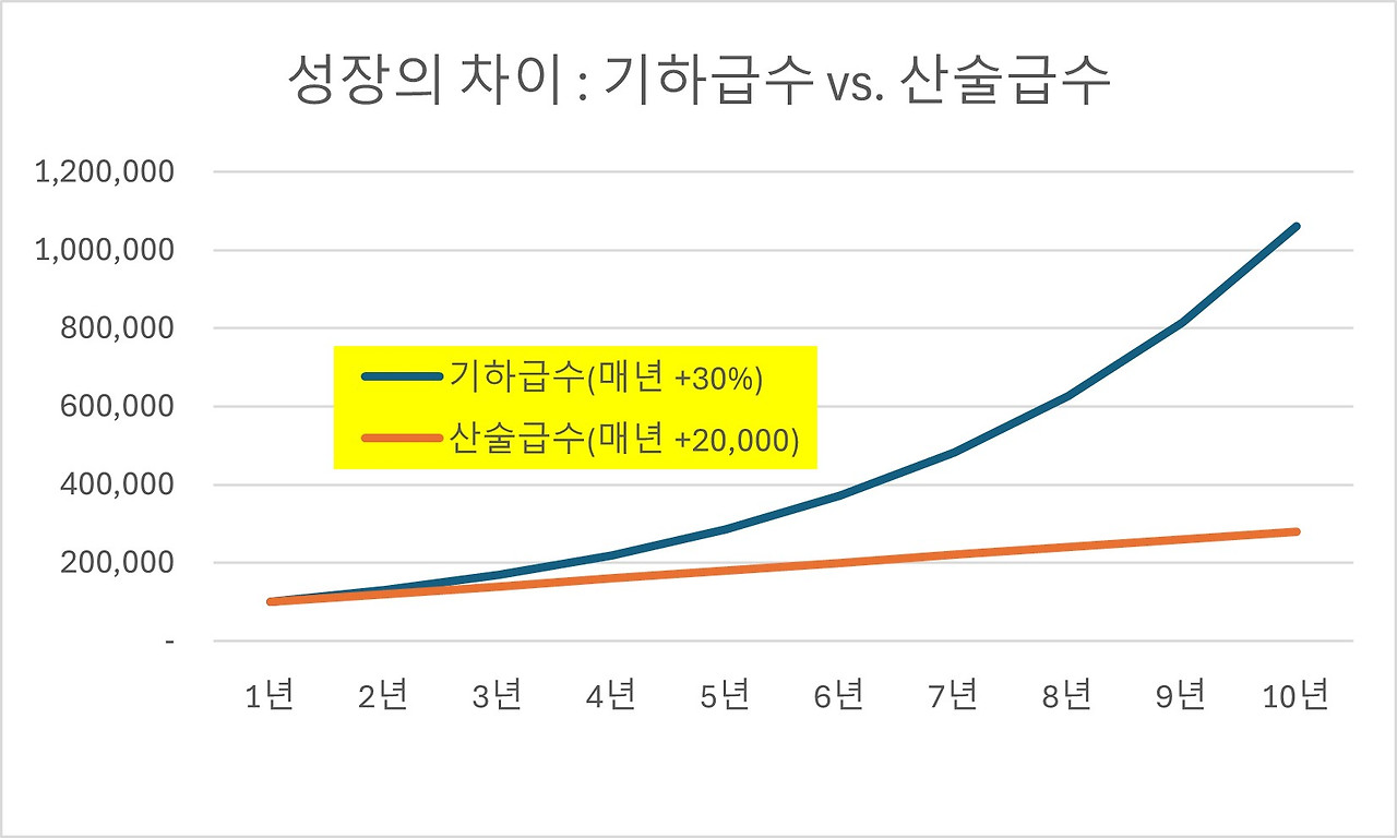 정률적 성장(+30%)과 정액적 성장(+20,000)의