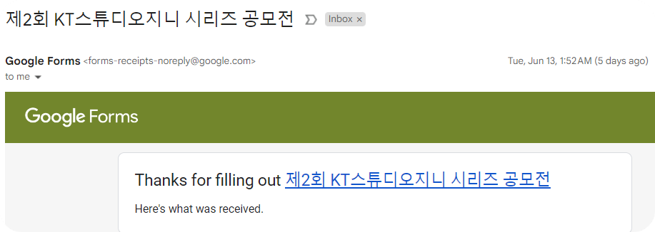 6월 13일 새벽 1시 52분, KT 스튜디오지니 시리즈 공모전에 응모했다.
