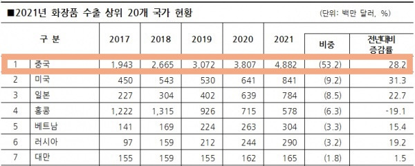2017년부터의 통계만 봐도 2021년까지의 화장품 수출은 매해 증가하고 있었고, 대 중국 수출 실적은 기록을 경신 중이다.