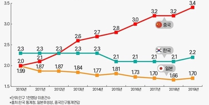 중국의 이혼율 3.1, 한국의 이혼율 2.0.