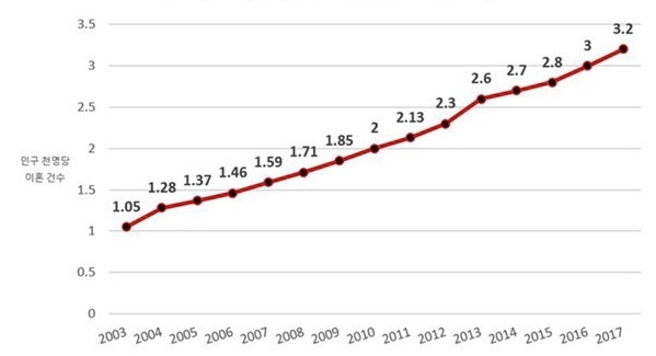 2000년 이전 1.0 이하였던 이혼율은 2010년 2.0을 넘기고 어느새 여기까지 올라왔다.