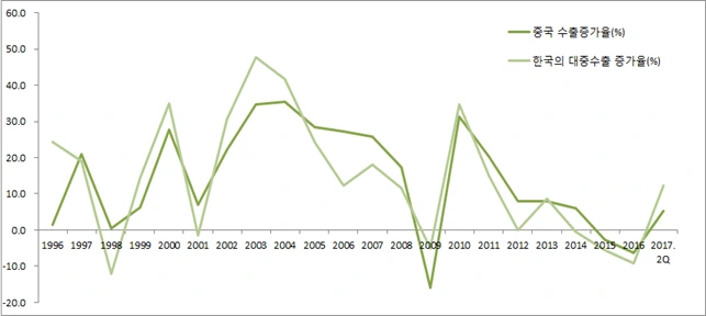 이 도플갱어 같은 두 선 중 하나는 ‘중국의 수출 증가율’이다. 그리고 다른 하나는 ‘한국의 대중국 수출 증가율’이다.