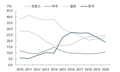 한국의 전체 수출액에서 보면 더욱 초라해서, 1.2%에 불과하다.