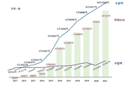 그리고 2021년 기준, 한국의 화장품 수출액 10조 5천억 원 중 중국이 차지하고 있는 비중은 53.2%(홍콩 포함 시, 61.3%)이다.