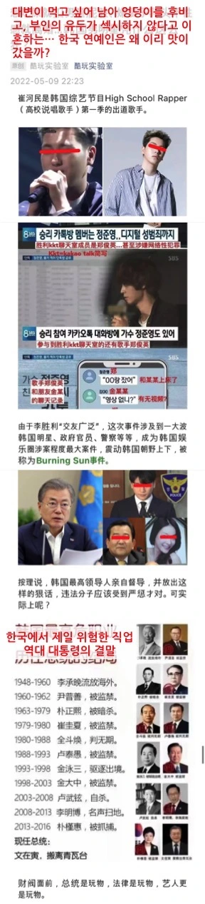 역대 대통령의 퇴임 후 스토리를 연예인의 부정적 가십과 한데 묶어 ‘말로의 비참함’을 비웃고 있다.