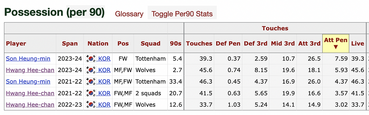 위 데이터는 황희찬의 그동안의 프리미어리그 시즌과, 똑같이 플레이 스타일에 변화를 꾀한 손흥민을 비교한 데이터이다.