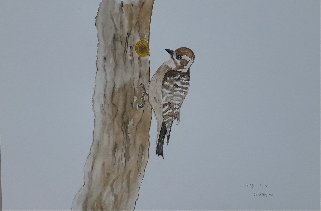 오늘 우리가 그린 쇠딱따구리는 딱따구리목, 딱따구리과다. 딱따구리는 우리나라에 11종이 있다고 한다. 그중 쇠딱따구리는 크기가 가장 작고 무늬도 화려하지 않다.