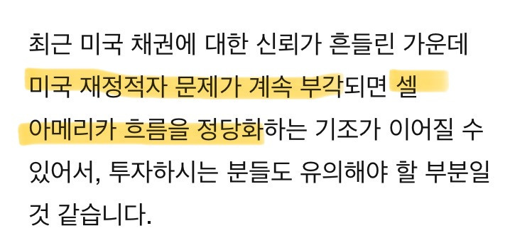 “재정적자 이슈”가 셀아메리카(미국 자산 매도) 흐름의 “정당성” 부여 요인으로 부각됨.