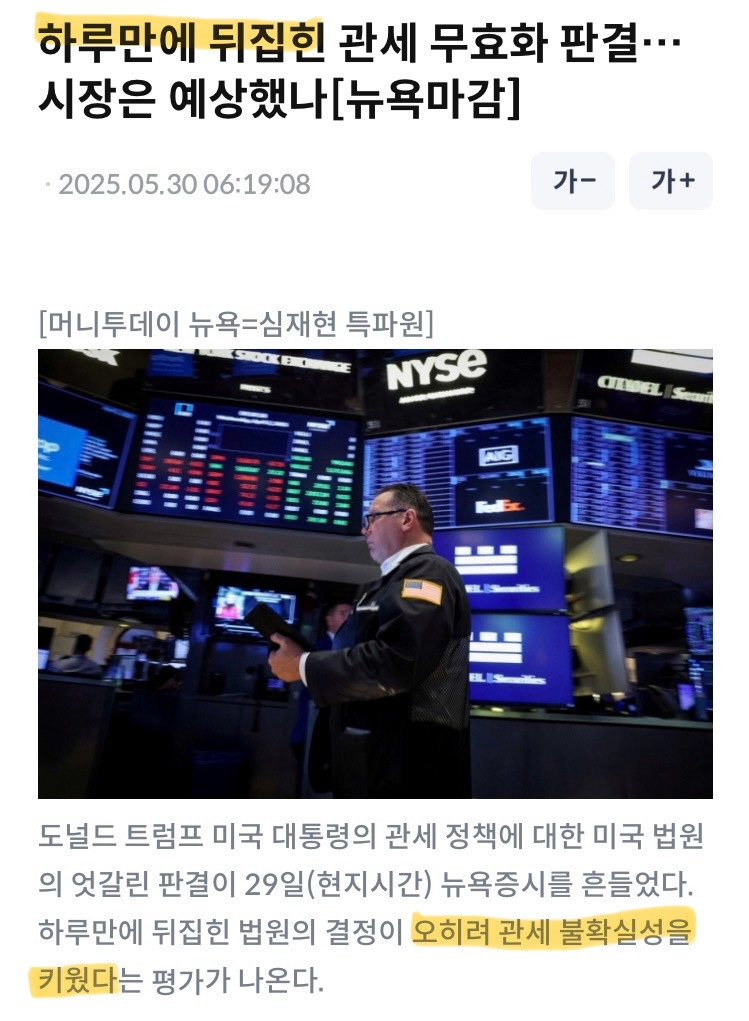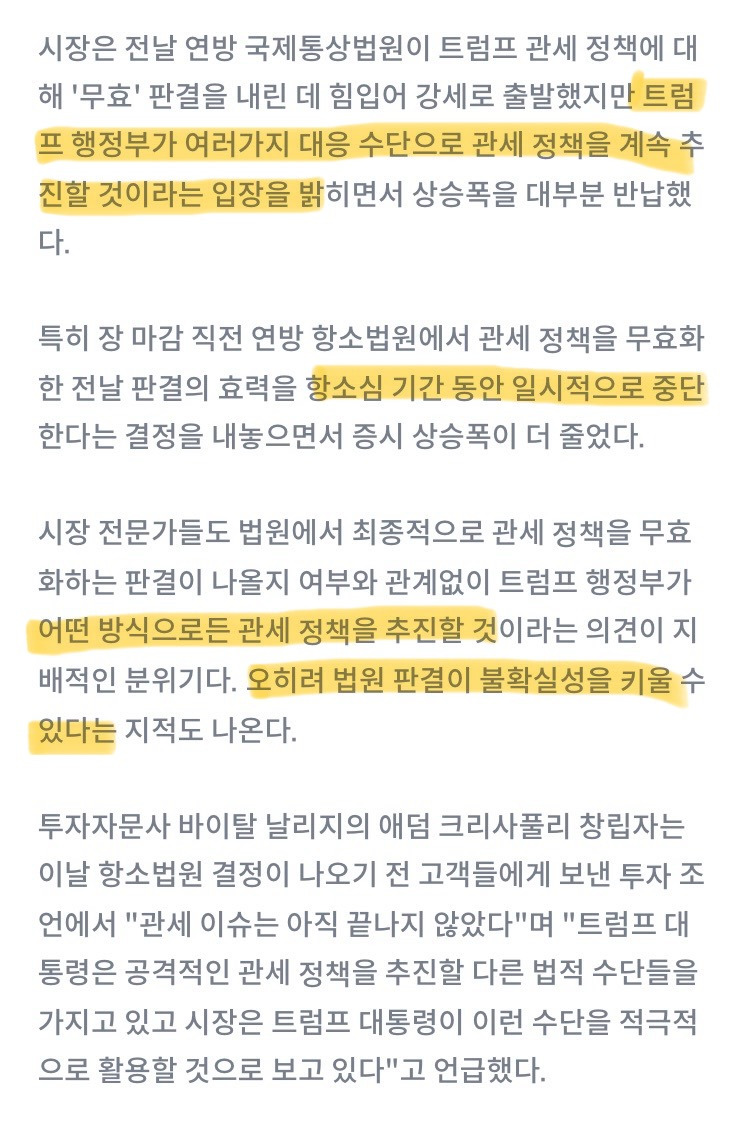 •법원의 관세 무효화 판결이 하루 만에 뒤집혀 “불확실성”이 확대