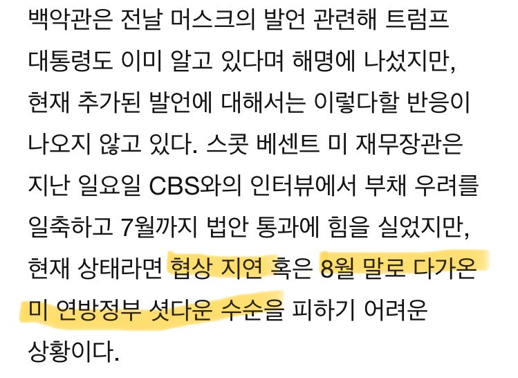 •미 의회 “예산안 협상 지연”과 “8월 말 연방정부 셧다운 리스크” 경고, 머스크까지 “예산안 폐기하라” 압박. 재정적자(10년간 2조 4,200억 달러)와 정책 리스크가 교차하며, 안전자산 선호 심리 극대화.
