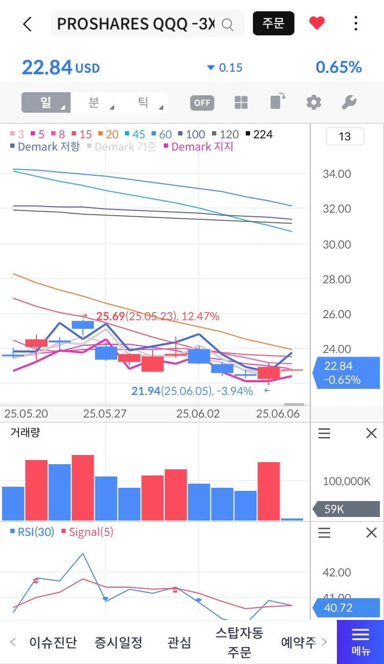 •차트/RSI: 일봉상 횡보 후 하락, RSI(30) 40.72, Signal(5)보다 낮음
