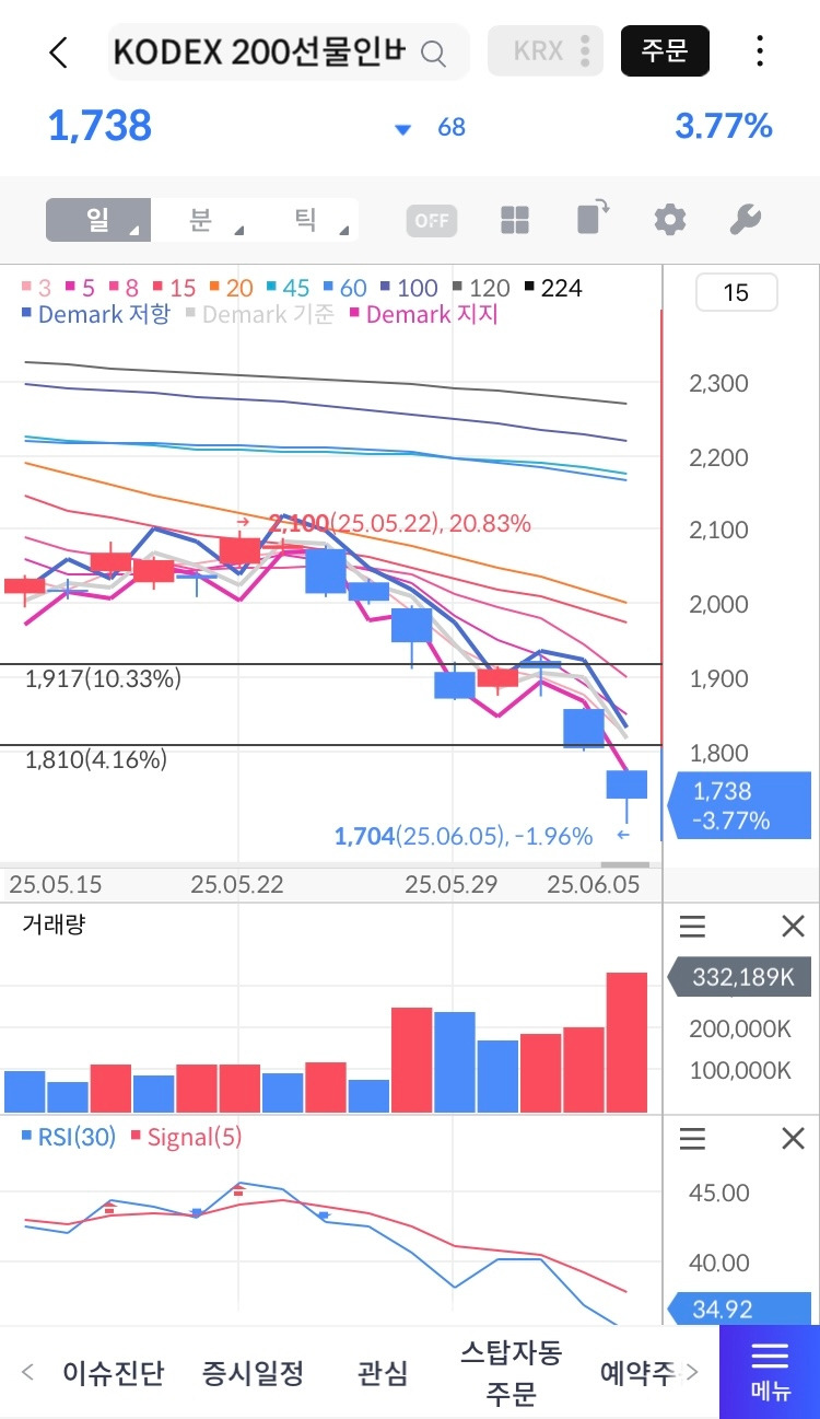 •차트/RSI: 일봉상 고점 형성 후 횡보+반등, RSI(30) 34.92, Signal(5) 아래