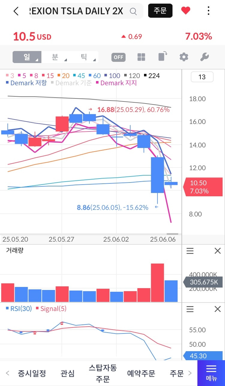 오늘 시장에서 대중의 감정, 정책권력의 심리전, 그리고 투자 기표의 역배치를 가장 효과적으로 활용할 종목은 “테슬라 2X 레버리지”다.