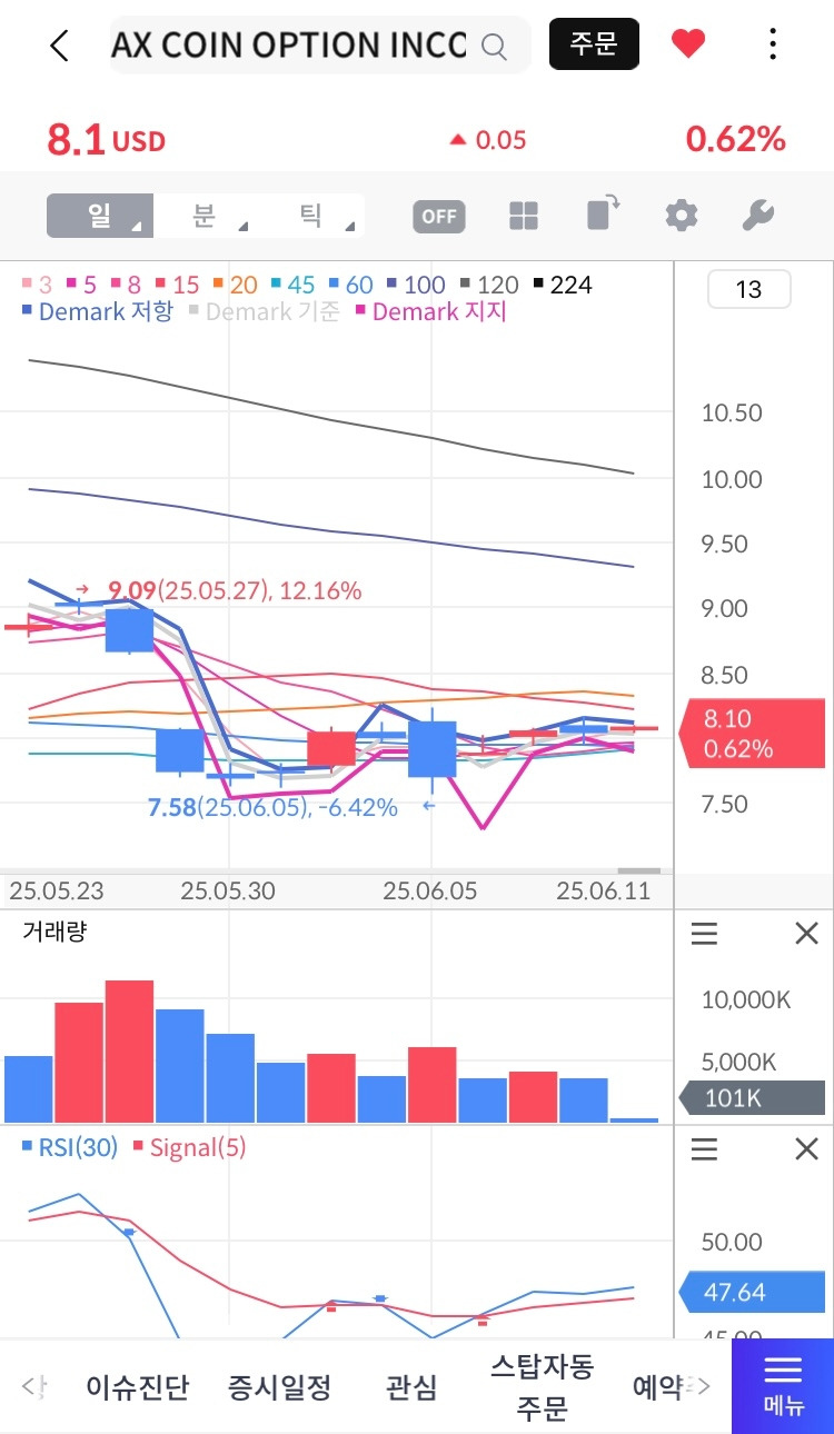 저점(7.6~8.1$) 횡보+반등, RSI(30)=47.64(과열장이라 완벽한 저점은 아님)