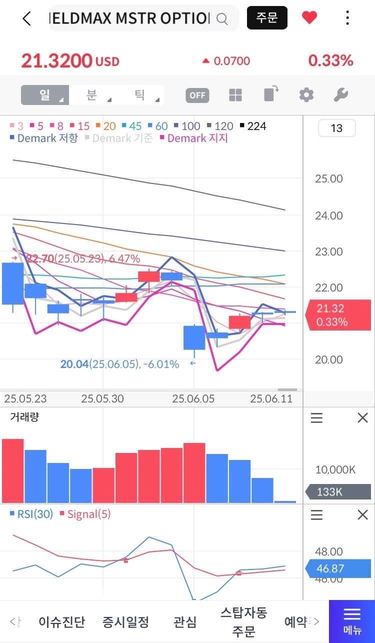 강한 저점(20~22$)에서 1차 반등 후 조정, RSI(30)=46.87, Signal(5)와 교차,