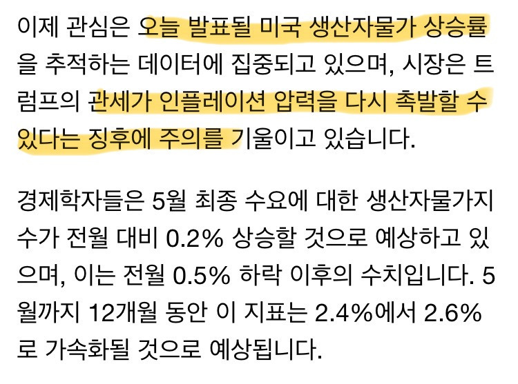 •PPI가 시장 예상치 상회(인플 압력 부각) > 연준의 금리인하 기대 약화, 리스크 오프(주식/원자재 조정·달러 강세)
