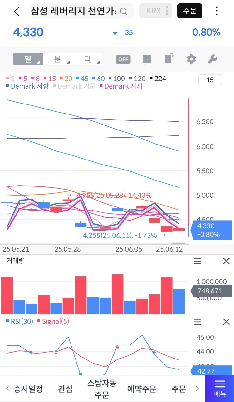 •RSI(30): 42.77 (Signal(5)=아래), 조건 충족