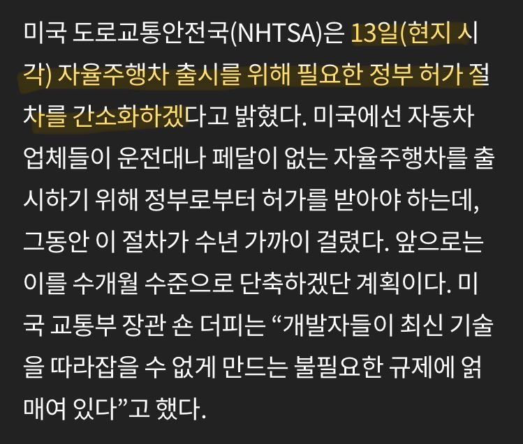 •미국 정부가 자율주행차 출시 관련 정부 허가 절차를 수개월 단축하는 “규제 완화 정책” 본격화
