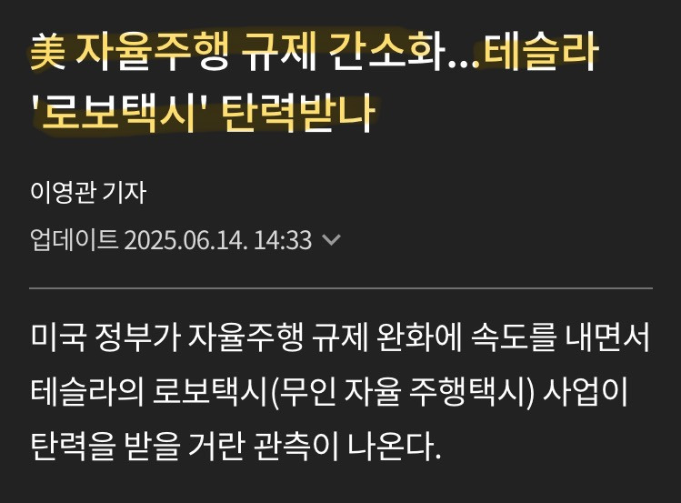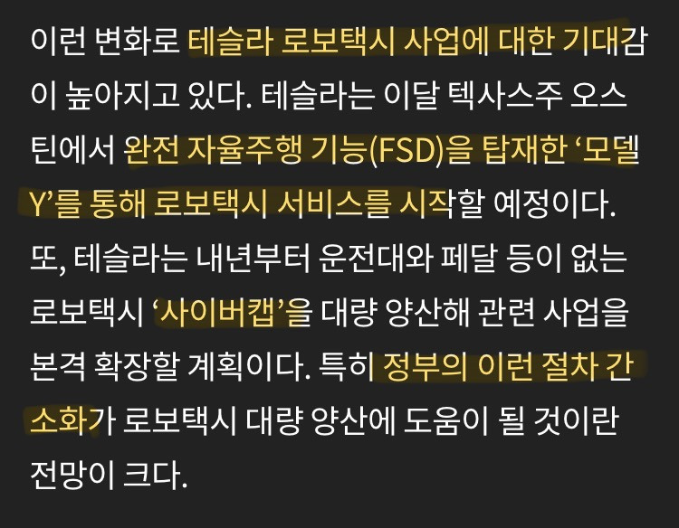 •테슬라가 이달 텍사스 오스틴에서 모델Y 기반 완전 자율주행(FSD) 로보택시 서비스 개시 예정, “로보택시 출시” 모멘텀 + “규제완화” 수혜 프레임 부각