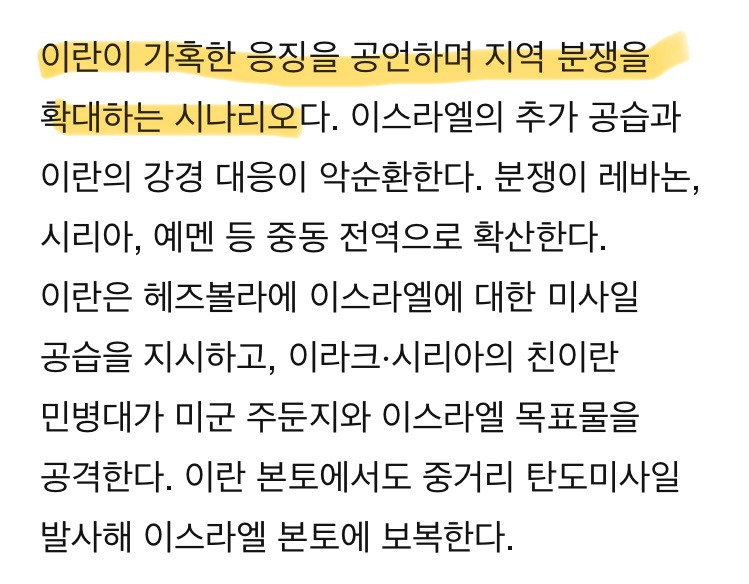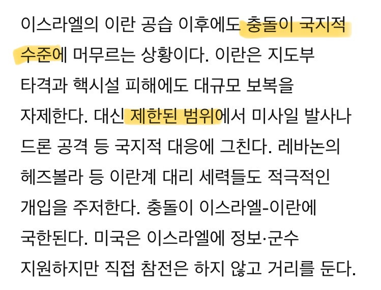 현재 이란과 이스라엘 모두 전면전은 부담, 미국 역시 확전 원치 않음.
