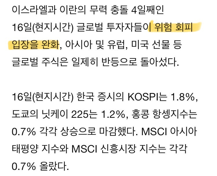 • 글로벌 투자자, 충돌 장기화에도 “위험회피 심리 완화” 리스크 오프 해제, 주식 등 위험자산 재진입