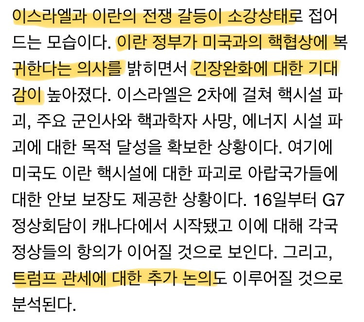 •중동 이란-이스라엘 분쟁이 소강상태로 진입, 이란이 미국과의 핵협상 복귀 의사 표명 > 지정학적 리스크 완화