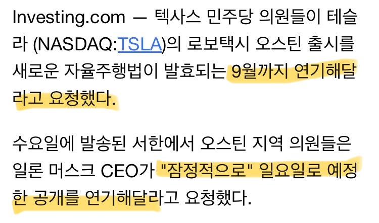 •즉시: 텍사스 의원의 연기 요청 보도 > 실망/불신/불확실성 확대