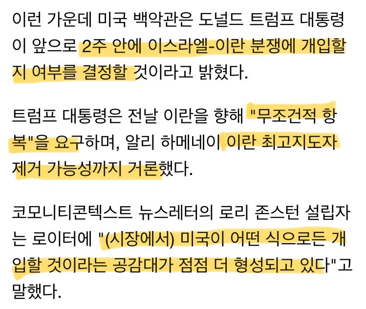 •미국이 2주 내 개입 여부를 결정할 것이라는 메시지로, “직접 참전”은 아직 확정 아님.