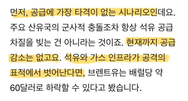 즉, 시장은 당분간 유가 리스크 프리미엄을 반영하겠으나, 석유/가스 인프라의 물리적 피해가 현실화되지 않으면 “급락(브렌트유 $60선, 단기 조정 가능) 구조”
