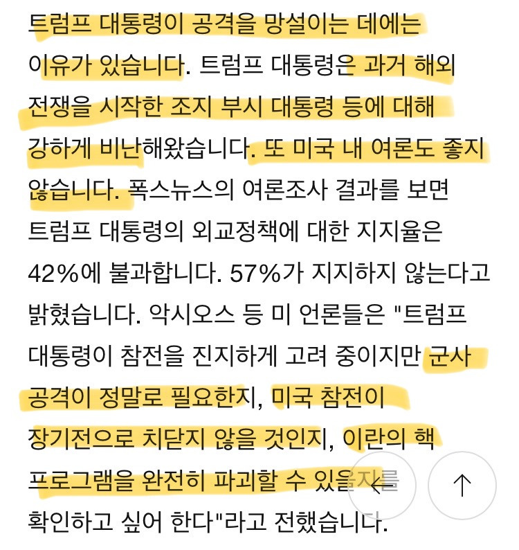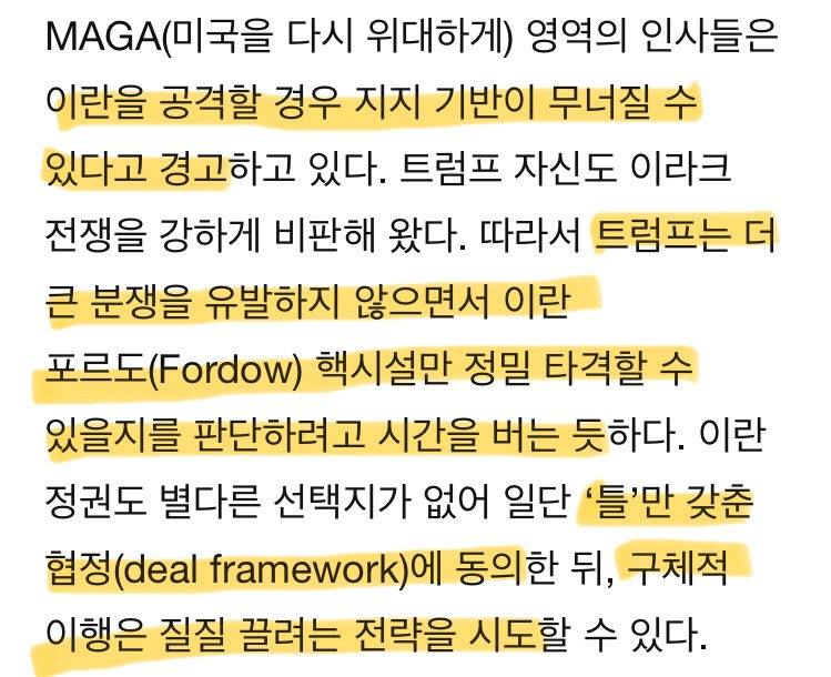 •MAGA 진영조차 “이란 공격시 지지기반 무너질 수 있다” 경고, 트럼프도 “핵시설만 정밀 타격” or “딜 프레임워크 합의 후 질질 끌기” 전략 선택