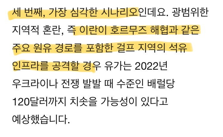 •중동 내 광역 충돌, 이란이 호르무즈 해협 등 주요 원유 경로/인프라 실질 타격 시, 2022년 우크라 사태급 유가 급등(최고 $120까지 가능성)