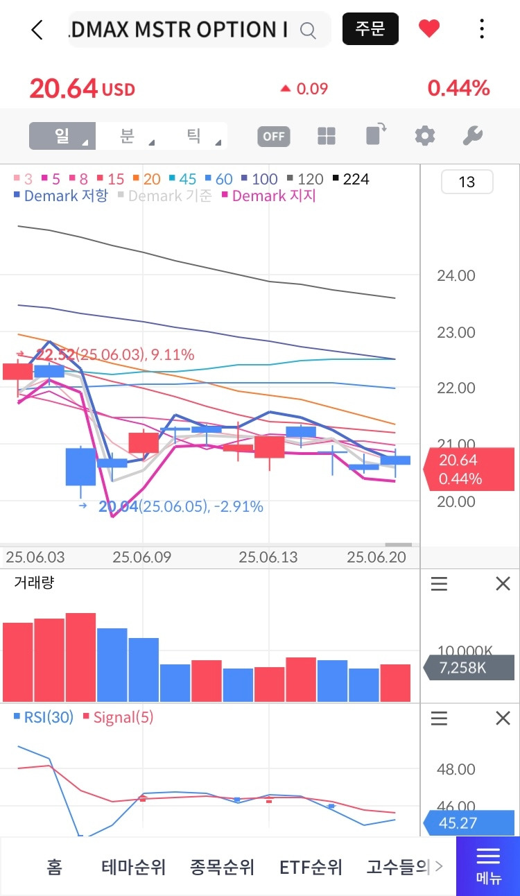 •RSI: 45.27, Signal(5)보다 근소하게 낮음, 30~45 근접, 저점 매수세 유입 조짐
