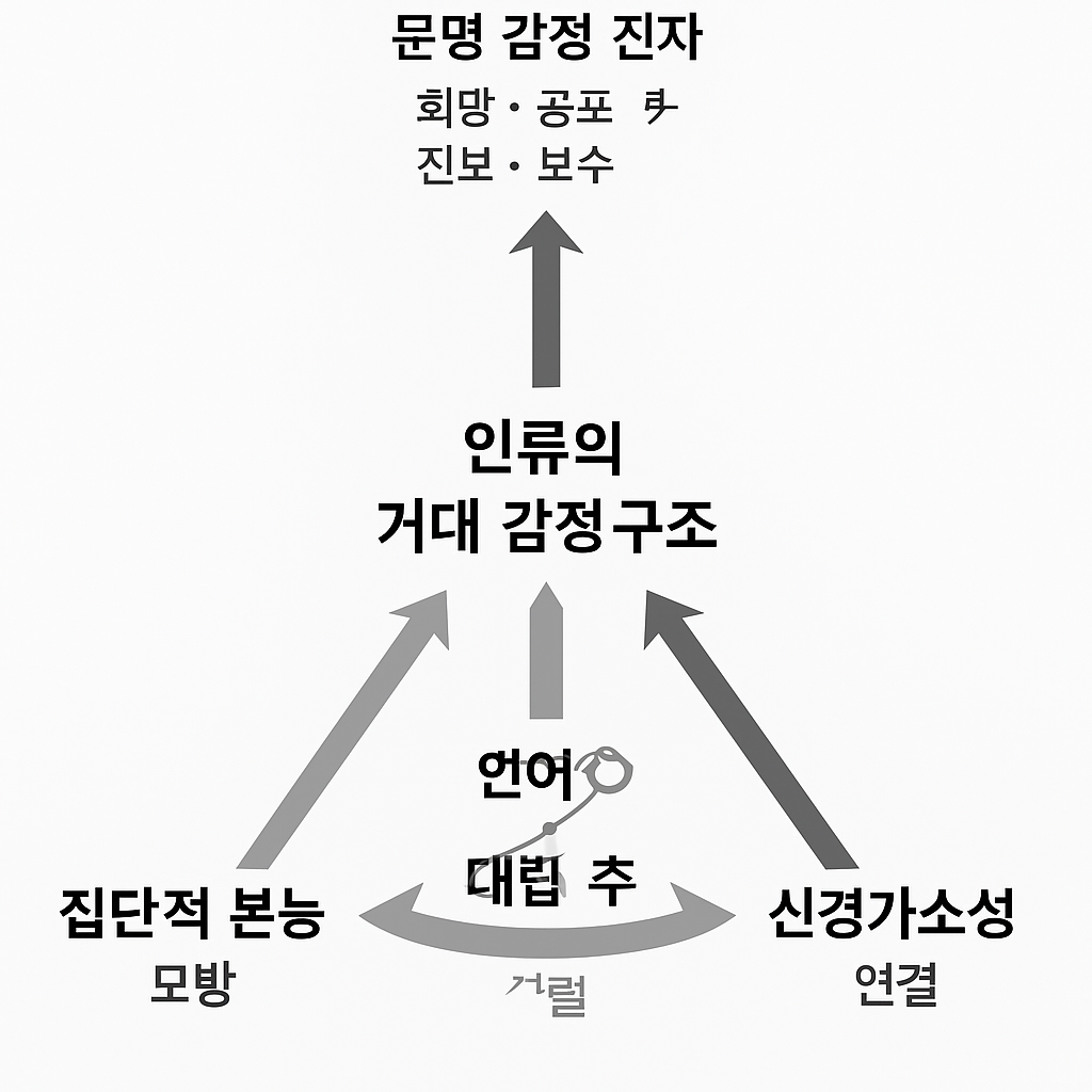 (진화적 군집 본능) + (언어적 대립 구조) + (신경가소성의 감정 회로화)