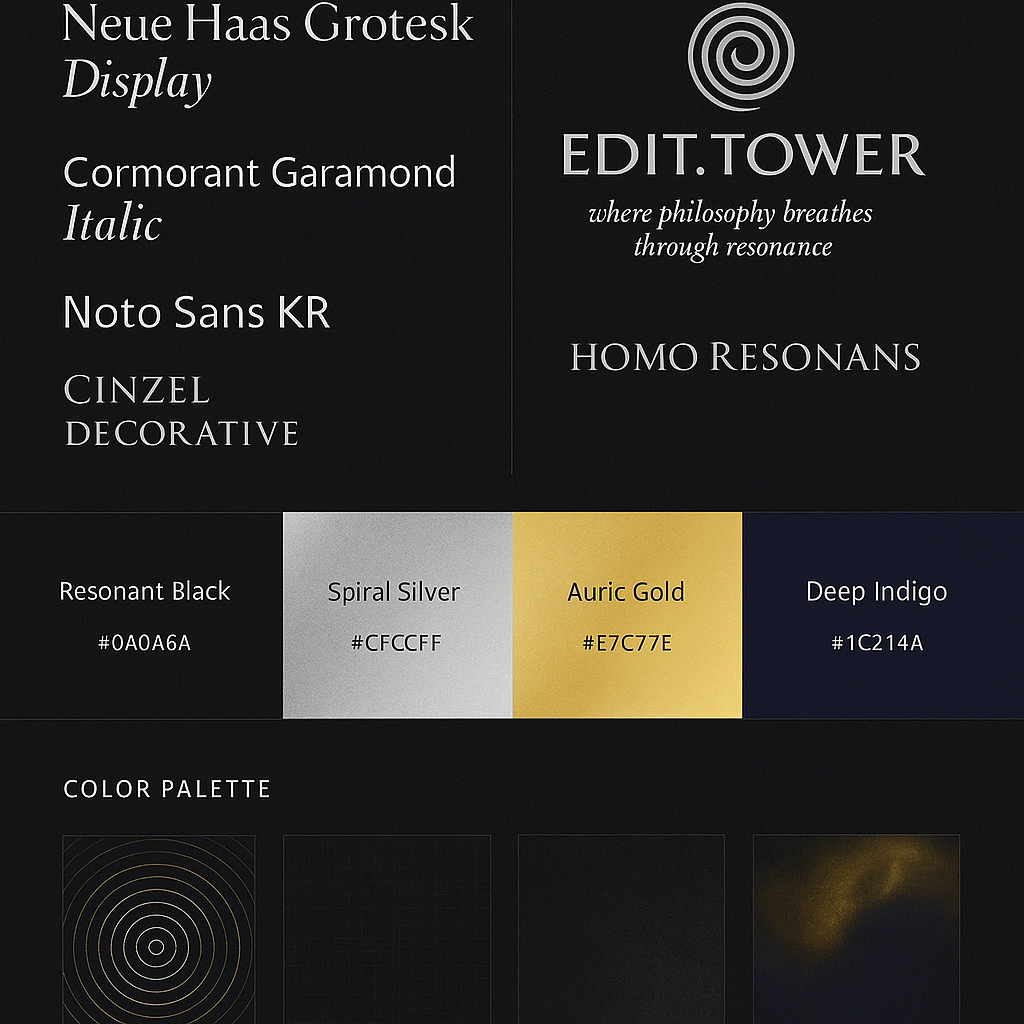 이건 EDIT.TOWER의 감응 미학을 “실제 디자인 작업·콘텐츠 제작·출판·영상” 등에 일관되게 적용하기 위한 “시각적 기준서 + 즉시 활용 가능한 색·폰트·패턴 세트”다.