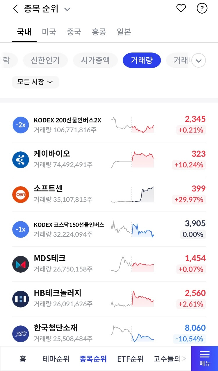 1. ‘종목순위’ 메뉴 클릭 후 ‘국내’, ‘거래량’ 기준으로 정렬.